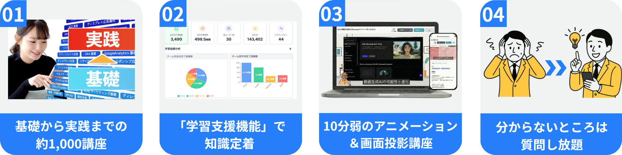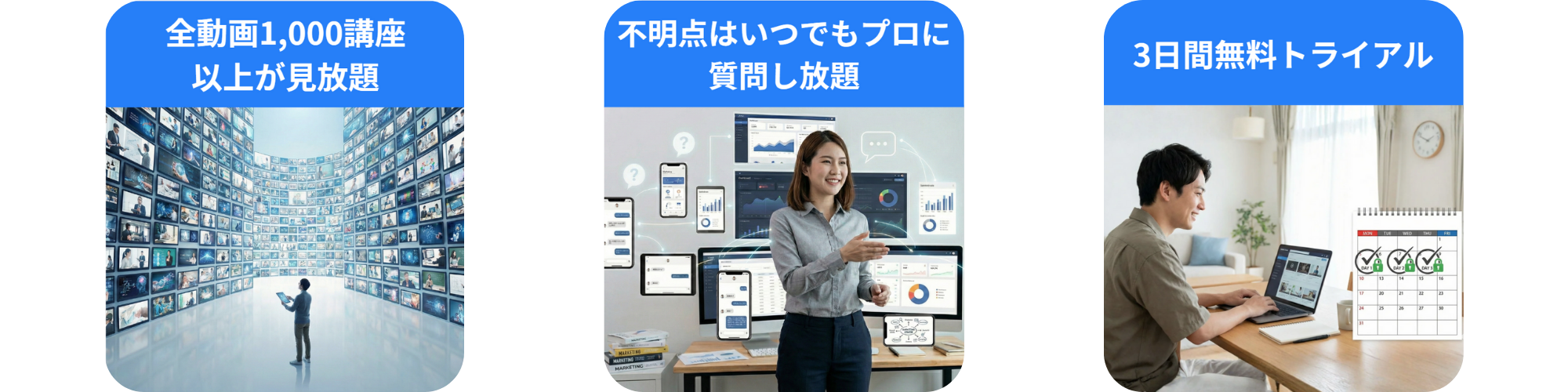 デジタルマーケティングや最新の生成AIまで網羅する約1,000の講座をラインナップ。未経験者が基礎を固める入門編から、プロが現場で即活用できる高度な実践手法、最新AIの活用事例まで幅広く学べます。自分一人の力では到達しにくい専門知識を体系的に習得することで、変化の激しい市場でも通用する確かな実力と、キャリアへの自信を身につけることが可能です。