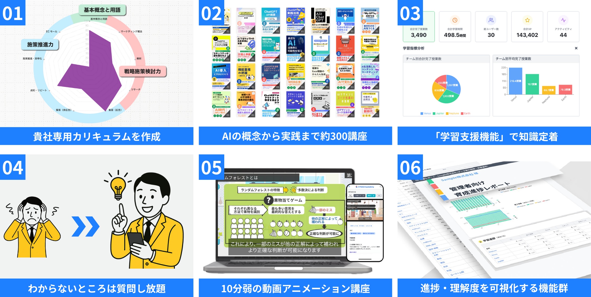 目的 | 体系的にスキルを定着させ、質問し放題で学習の壁を回避 | 短時間で社内のAIリテラシーを底上げし、AI化のきっかけに |